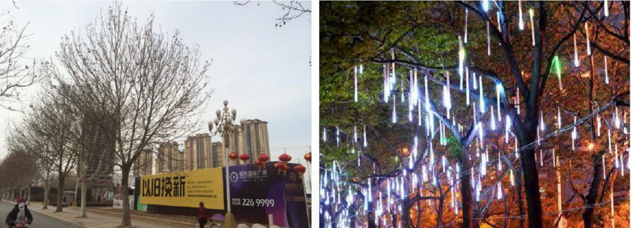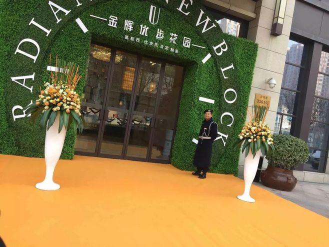 ? 售樓處門前小廣場,連成排掛滿紅色燈籠,要求密集成排懸掛。
